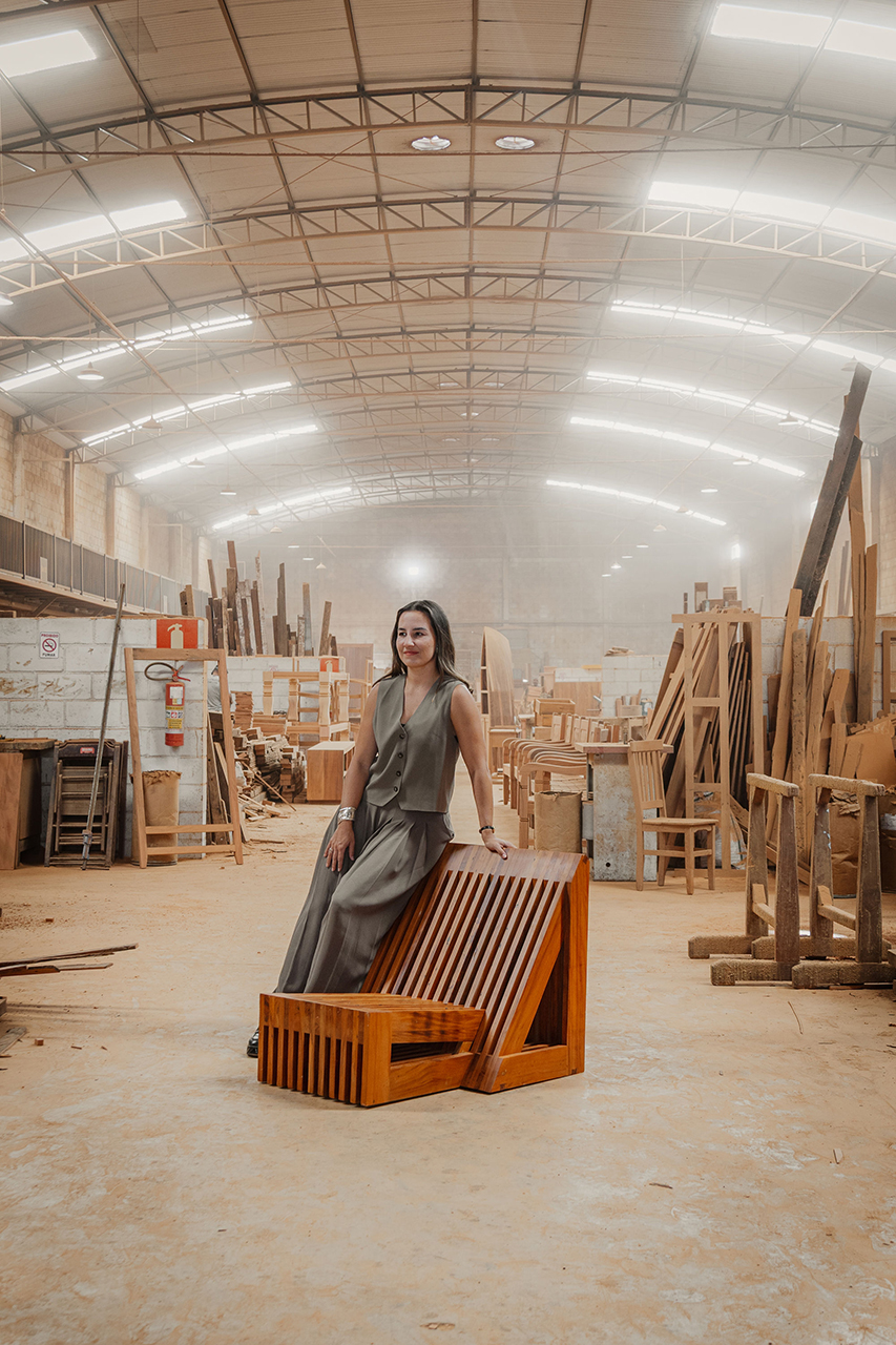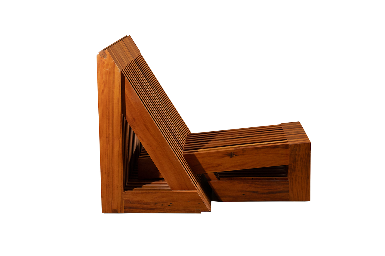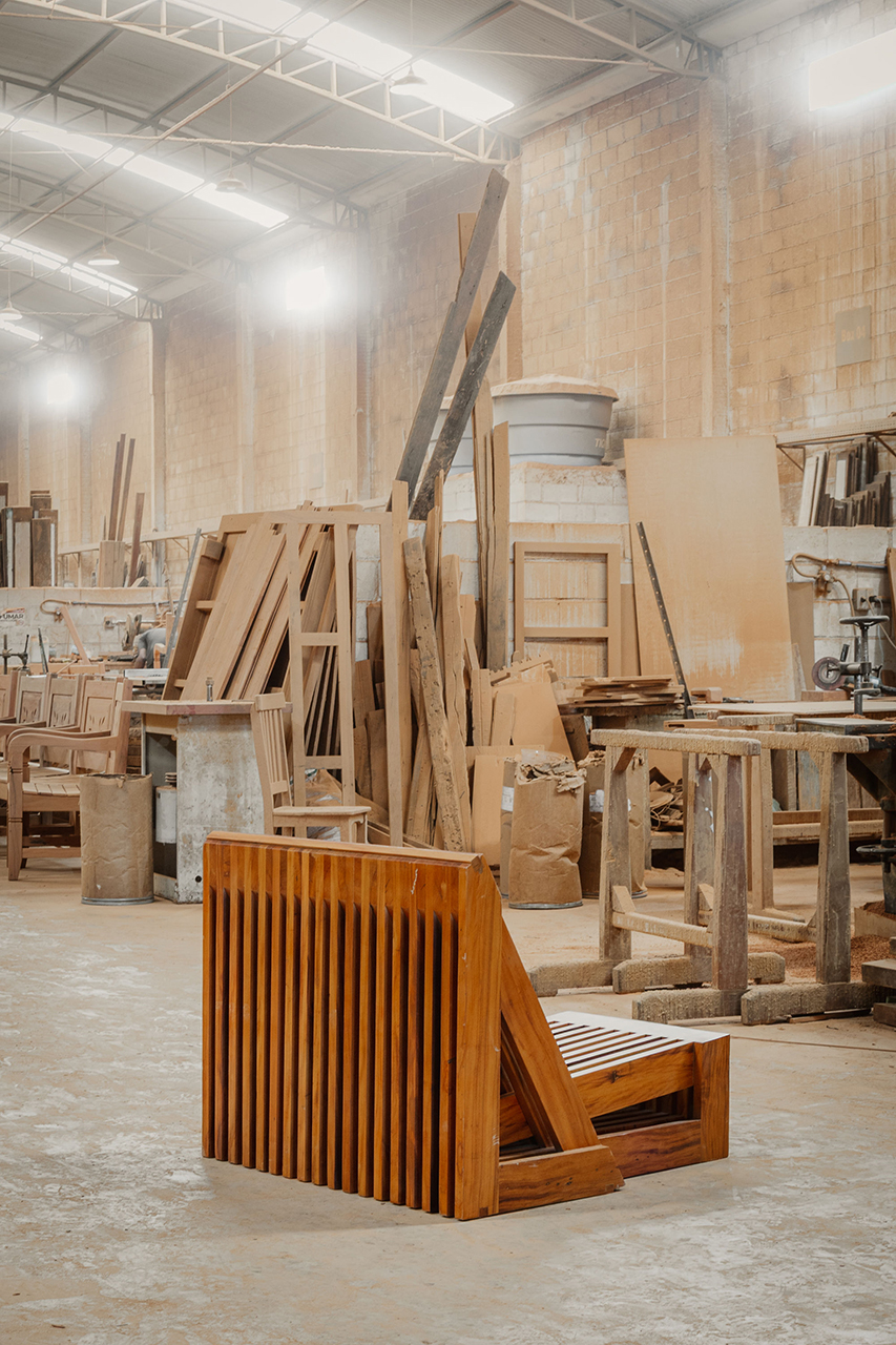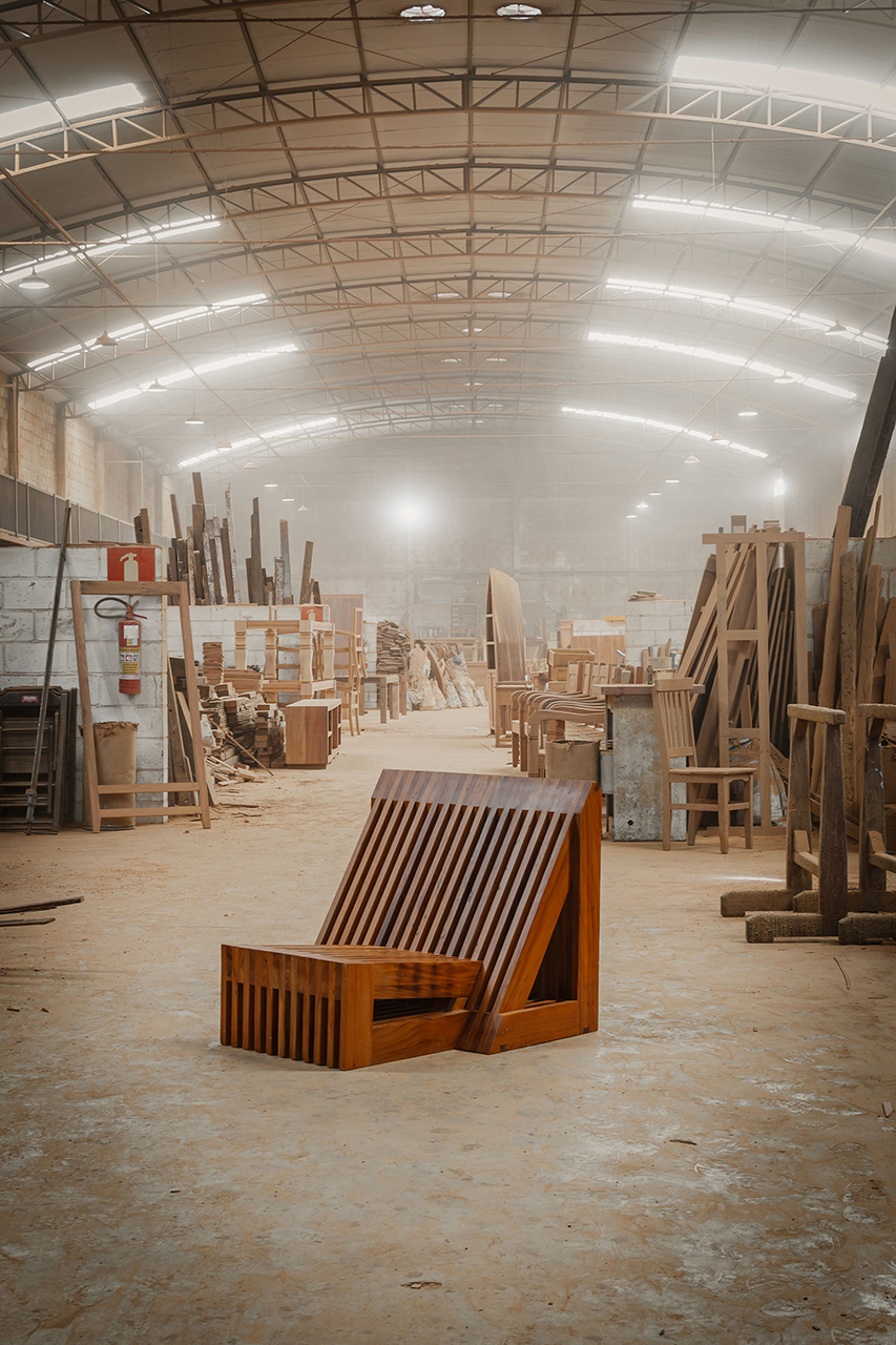 A poltrona Rio tem como premissa o uso de linhas geométricas puras e simples, que evocam a sensação de leveza e permeabilidade, convidando à contemplação e relaxamento. Seu contraponto se dá pela volumetria generosa, que usa como forma final a expressão da desconstrução brutalista, explorando uma linguagem autêntica e marcante. Inspirada nos traços modernistas dos brises e sua importância rítmica na arquitetura da época, o formato das ripas da poltrona Rio faz alusão ao MAM (Museus de Arte Moderna) do Rio de Janeiro, cidade cujo nome a batiza. Projetado por Affonso Eduardo Reidy, um dos pioneiros na introdução da arquitetura modernista no Brasil, o MAM tem como identidade marcante os pilares em trapézio vazado se repetindo a cada 10 metros, que funcionam como elemento estrutural e plástico na utilização do concreto. As linhas geométricas do design brutalista são homenageadas no formato e cadência das ripas de madeira que compõem a poltrona, resultando numa releitura contemporânea que abraça a identidade da história da nossa arquitetura.