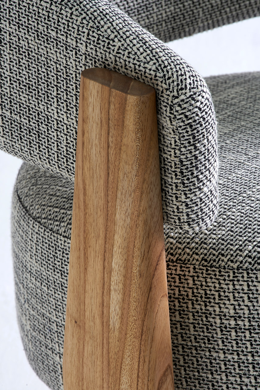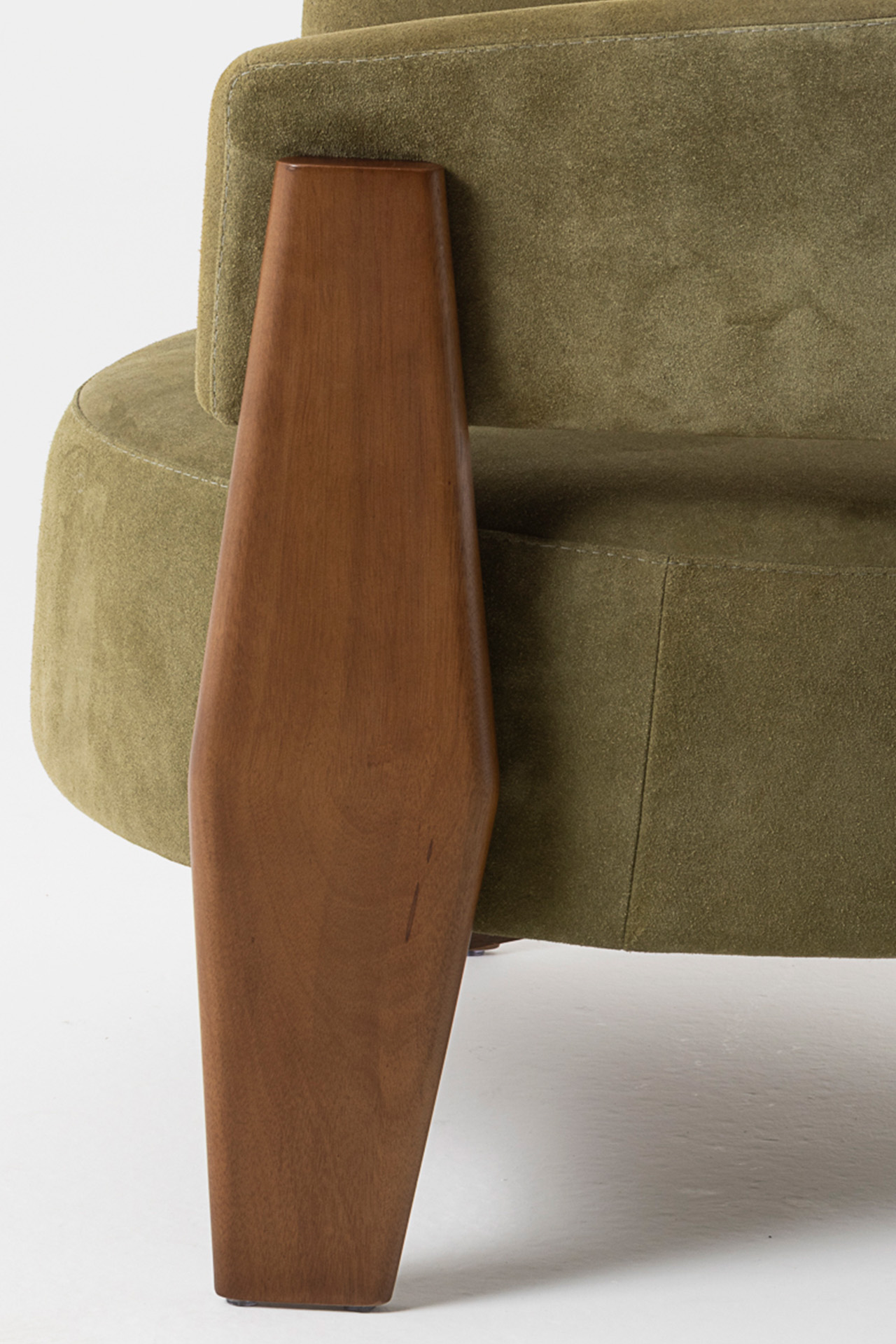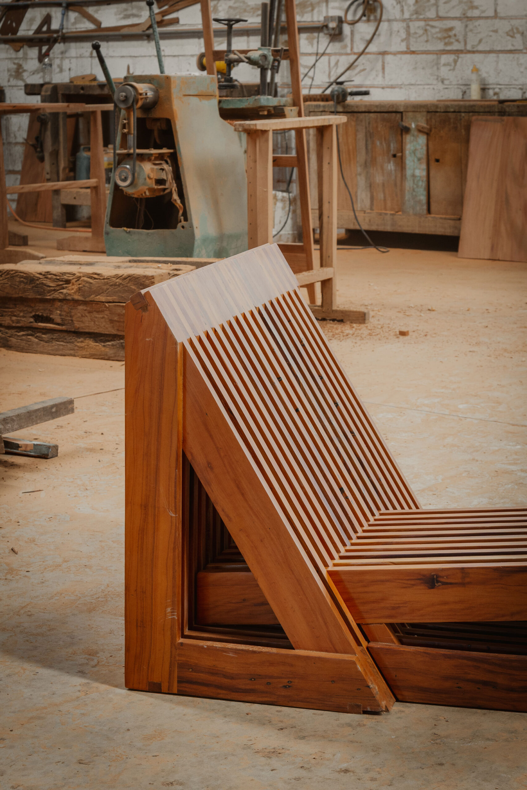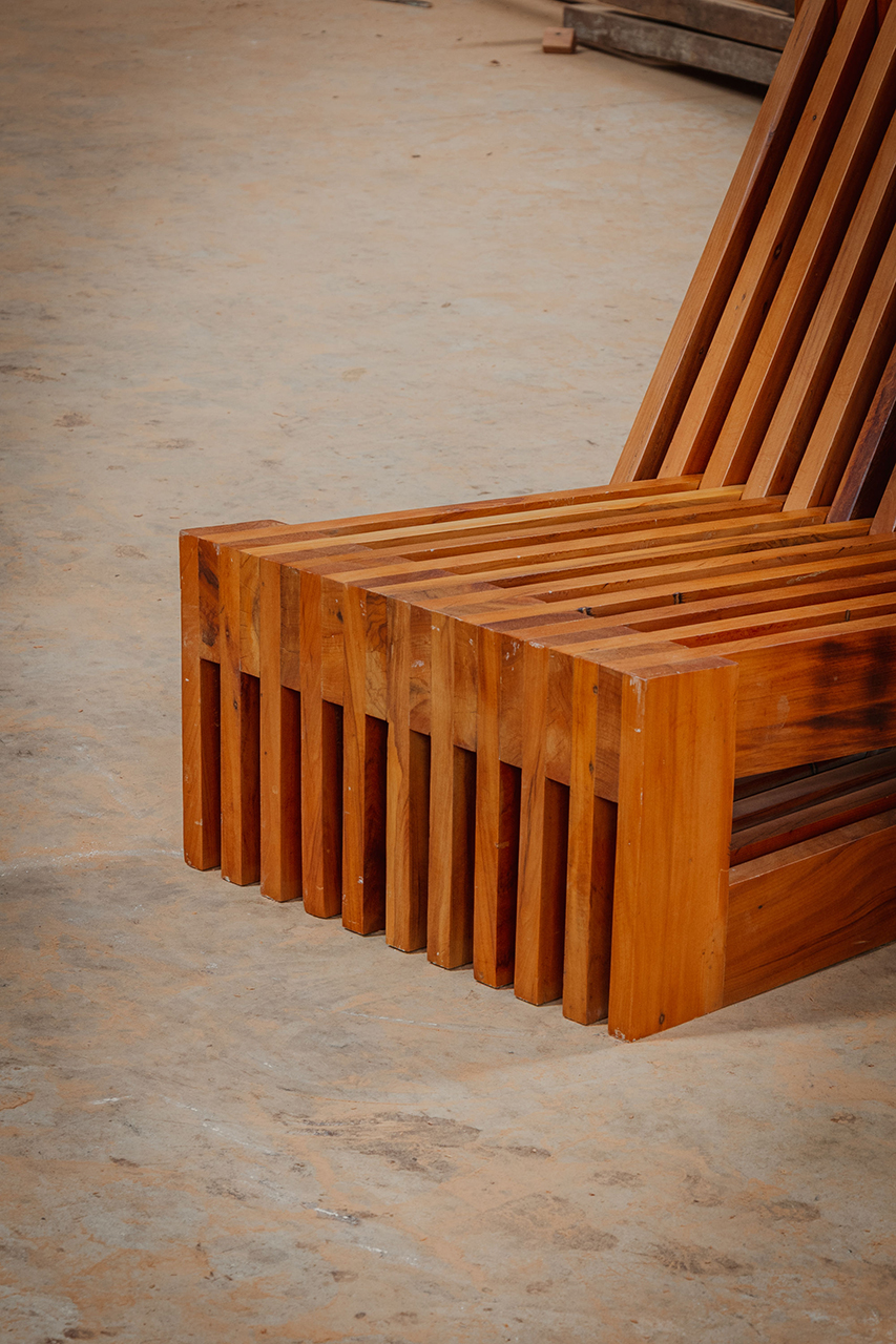 A poltrona Rio tem como premissa o uso de linhas geométricas puras e simples, que evocam a sensação de leveza e permeabilidade, convidando à contemplação e relaxamento. Seu contraponto se dá pela volumetria generosa, que usa como forma final a expressão da desconstrução brutalista, explorando uma linguagem autêntica e marcante. Inspirada nos traços modernistas dos brises e sua importância rítmica na arquitetura da época, o formato das ripas da poltrona Rio faz alusão ao MAM (Museus de Arte Moderna) do Rio de Janeiro, cidade cujo nome a batiza. Projetado por Affonso Eduardo Reidy, um dos pioneiros na introdução da arquitetura modernista no Brasil, o MAM tem como identidade marcante os pilares em trapézio vazado se repetindo a cada 10 metros, que funcionam como elemento estrutural e plástico na utilização do concreto. As linhas geométricas do design brutalista são homenageadas no formato e cadência das ripas de madeira que compõem a poltrona, resultando numa releitura contemporânea que abraça a identidade da história da nossa arquitetura.